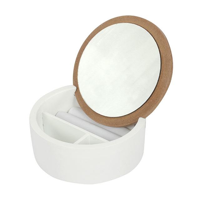 Škatlica za nakit se odpre tako, da se na pokrovčku pokaže majhno ogledalce, ki vedno pride prav za “na hitro” urejanje in zapenjanje nakita.